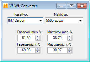 Aufgabe ist die Berechnung der Laminat-Eigenschaften einer Lage mit IM7-Kohlenstofffaser und 5505 Epoxid-Matrix. Die Matrix macht 30.97 % der Lage aus.