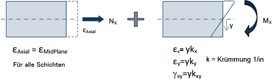 Laminatlasten können problemlos summiert werden . Betrachten Sie beispielsweise zwei Lasten auf einem Laminat: eine axiale Last und eine Biegungslast. In diesem Fall muss man lediglich die axialen Dehnungen und die Biegungsdehnungen addieren.