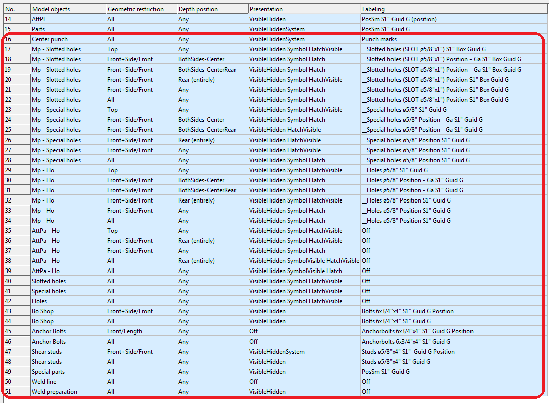 - Die Sichtbarkeit/Schraffur/Beschriftung in der Lochdefinition für HT und Anbauteile wurden überarbeitet, ebenso die Datensätze für die Sichtbarkeit und Beschriftung von Elementen.