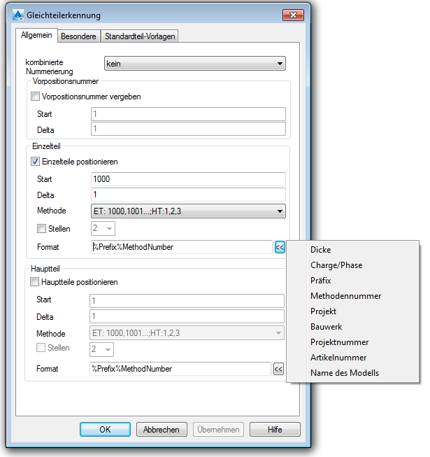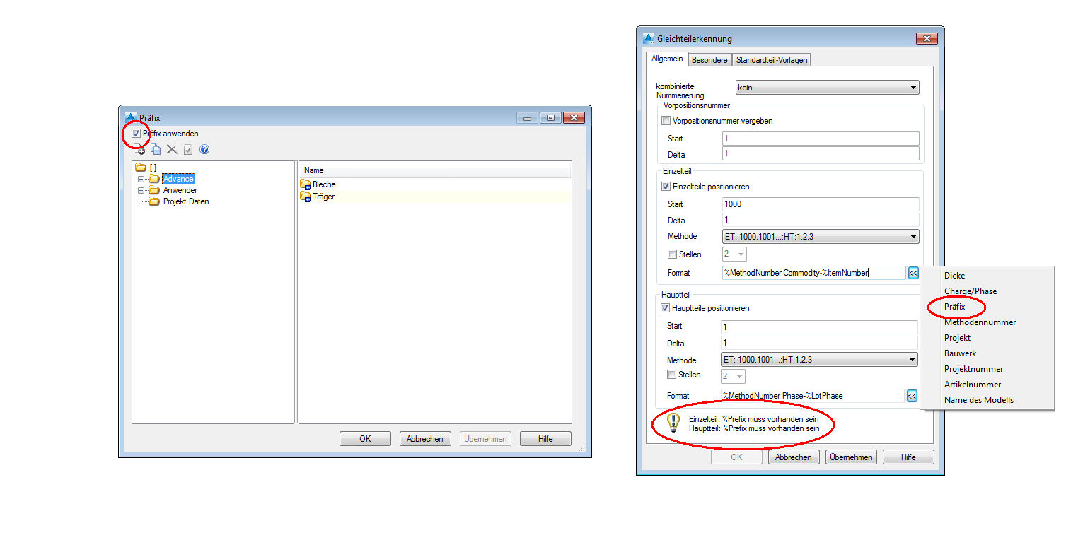 - Die Variable Präfix ist erforderlich, wenn Sie in der Konfiguration für das Präfix die Option Präfix anwenden aktivieren (Multifunktionsleiste: Ausgabe > Teilemarkierungen: