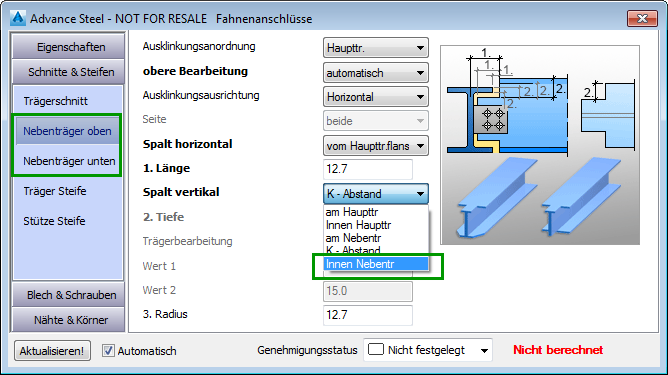 Außer den bisherigen Optionen Innen Hauptträger, am Hauptträger und am Nebenträger können Sie jetzt auch die Option Innen Nebenträger wählen, wodurch die vertikale Bemaßung des Ausklinkungsspalts ausgehend von der inneren Flanschkante des Nebenträgers berechnet wird. Die neue Option steht in den Eigenschaften für Anschlüsse auf den entsprechenden Registerkarten für Ausklinkungen sowohl oben als auch unten zur Verfügung.