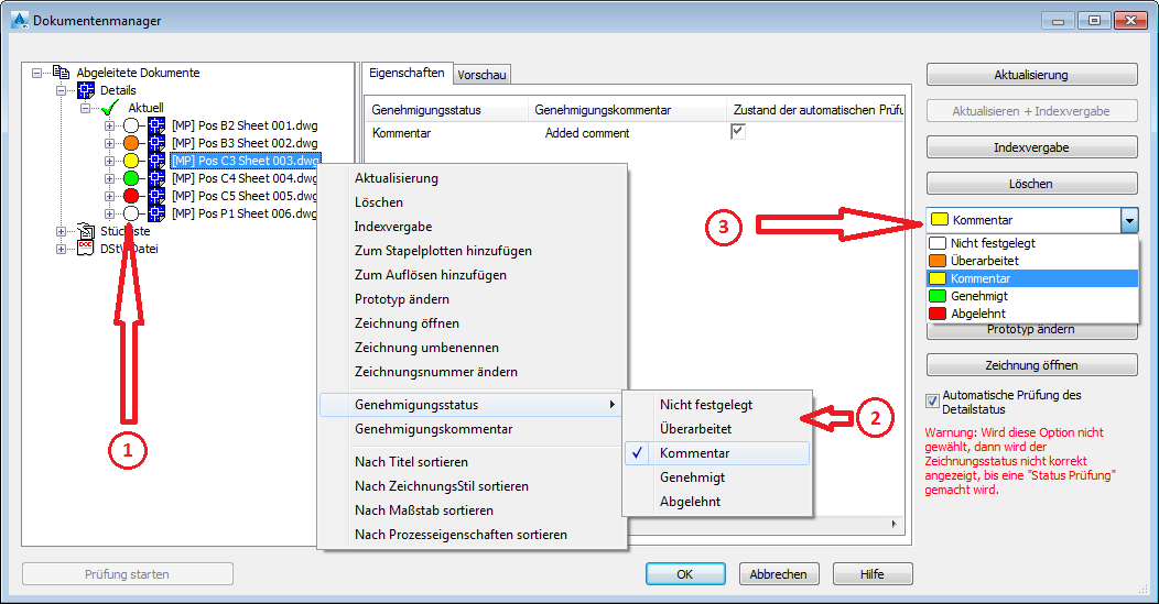 Der Genehmigungsstatus der Zeichnungen und die Kommentare werden auf der Registerkarte Eigenschaften des Dialogfelds angezeigt, und Sie können die Liste der Zeichnungen nach Genehmigungsstatus oder Genehmigungskommentar sortieren.