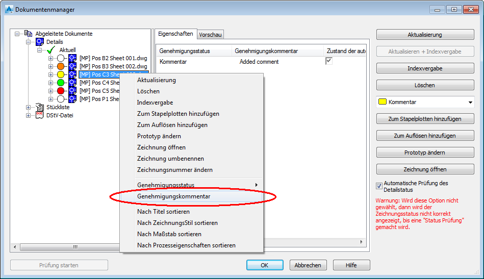 Um einen Zeichnungskommentar hinzuzufügen, wählen Sie im Kontextmenü die Option Genehmigungskommentar.