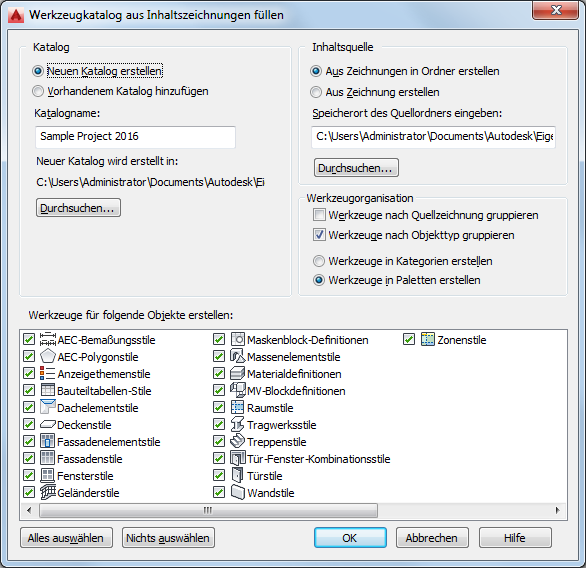 Anmerkung: Wenn Sie beide Optionen aktivieren, wird der Katalog zuerst nach Quellzeichnung und dann nach Objekttyp gegliedert, wobei aus den Zeichnungen Kategorien und aus den Objekttypen Paletten erstellt werden. Dies ist fest vorgegeben, da Paletten nicht verschachtelt werden können. Die Optionsfelder für Kategorien und Paletten stehen dann nicht zur Verfügung, und die Option Werkzeuge in Paletten erstellen ist automatisch ausgewählt.