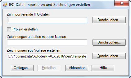 Wenn Sie eine IFC-Datei importieren, werden Zeichnungsdateien erstellt, die den einzelnen Bestandteilen der IFC-Projektstruktur entsprechen. Die Dateien werden zusammen in einer Haupt-Host-Datei referenziert, die die gesamte IFC-Datei darstellt. Beim Importieren wird außerdem eine Protokolldatei erstellt, die Objekte und Informationen zur geografischen Position enthält. Diese Datei wird am gleichen Speicherort wie die importierte IFC-Datei abgelegt. IFC-Dateien können in ein AutoCAD Architecture-Projekt oder als unabhängige Zeichnungen importiert werden.