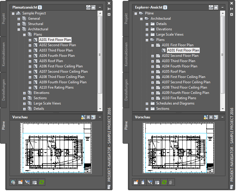 Pläne können in zwei verschiedenen Modi angezeigt werden. In der Explorer-Ansicht werden die Planzeichnungen in Kategorieordnern gruppiert. Wenn Sie in einer Planzeichnung Pläne oder Planansichten erstellen, werden diese in der Host-Planzeichnung platziert.