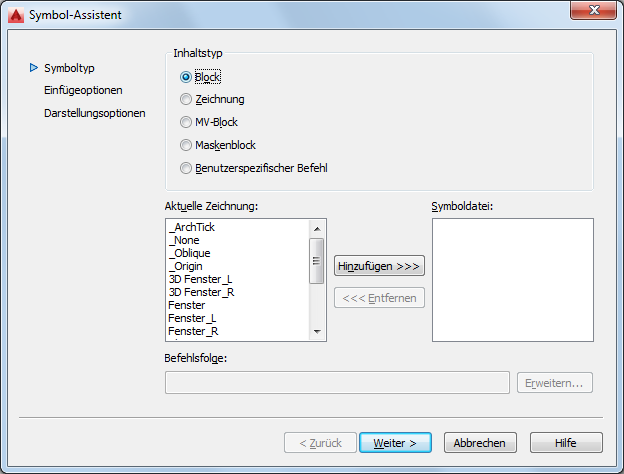 Der Symbol-Assistent hilft Ihnen bei der Erstellung eigener Symbole. Sie können Blöcke, Zeichnungen und Befehle aus Daten erstellen, die in der aktuellen Zeichnung existieren.