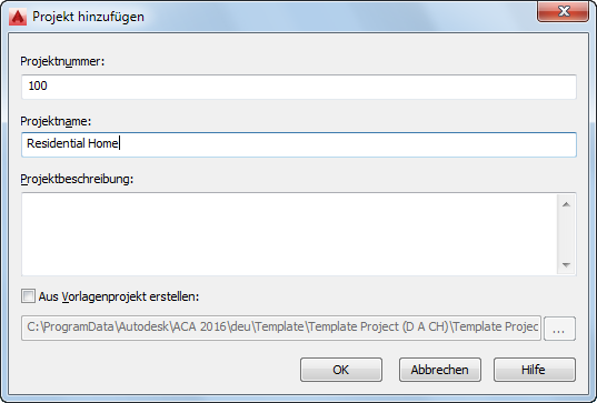 Anmerkung: Sie können beim Erstellen eines neuen Projekts nicht alle Support-Dateien und Pfade direkt festlegen, sondern nur Name, Nummer, Beschreibung und Projektvorlage.  Die übrigen Eigenschaften werden nach der Erstellung des Projekts festgelegt.  Wenn Sie das Projekt mithilfe einer Vorlage erstellen, werden zunächst deren Eigenschaften übernommen. Wenn Sie ein Projekt ohne Verwendung einer Vorlage erstellen, sind die Eigenschaften zunächst leer oder werden durch die AEC-Standardprojektoptionen definiert.