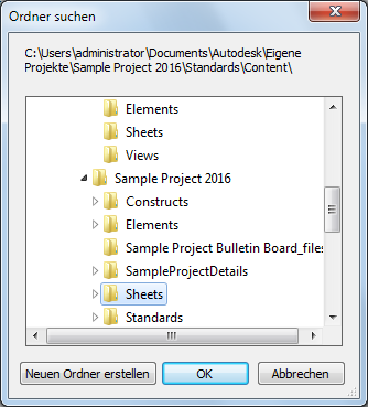 Wenn Sie einen anderen Speicherort für den obersten Kategorieordner (Gebäudemodule, Elemente, Ansichten und Pläne) angeben möchten, sollten Sie mit einem neuen Projekt beginnen. Ordnen Sie die Projektstruktur in Windows Explorer zunächst so an, dass sich die Kategorien in demselben Stammverzeichnis wie die APJ-Datei befinden. Ein Projekt kann z. B. die Kategorie Zeichnungen (Drawings) enthalten, unter der Konstruktionen (Constructs), Elemente (Elements), Ansichten (Views) und Pläne (Sheets) gruppiert sind.
