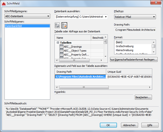 - Wählen Sie unter Schriftfeldkategorie die Option AEC-Datenbank.