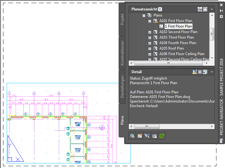 Eine Planansicht ist ein Ansichtsfenster für einen Papierbereich innerhalb der Planzeichnung. Eine solche Ansicht wird erstellt, wenn Sie eine Ansichtszeichnung oder eine Modellbereichsansicht aus der Projekt-Navigator-Palette in einen Plan ziehen.