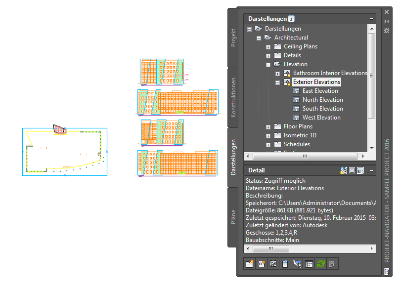 Sie erstellen eine Ansichtszeichnung, indem Sie Konstruktionen in der Projekt-Navigator-Palette wählen und sie in der Ansichtszeichnung referenzieren. Wenn Sie Ansichten erstellen, die mehrere Geschosse umfassen, wird jede Konstruktion an seiner relativen Geschosshöhe referenziert, wobei das unterste Geschoss bei Z = 0 eingefügt wird.