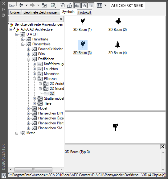 Wie im Katalog-Browser können auch in DesignCenter™ Symbole gespeichert, geordnet, gemeinsam verwendet und in Zeichnungen eingefügt werden. In DesignCenter werden die Symbole jedoch nicht anhand von Werkzeugen, sondern in einer hierarchischen Baumstruktur angezeigt; nachdem Sie ein Symbol ausgewählt haben, können Sie es in einer Vorschau anzeigen, bearbeiten oder auf eine Werkzeugpalette bzw. direkt in eine Zeichnung ziehen.