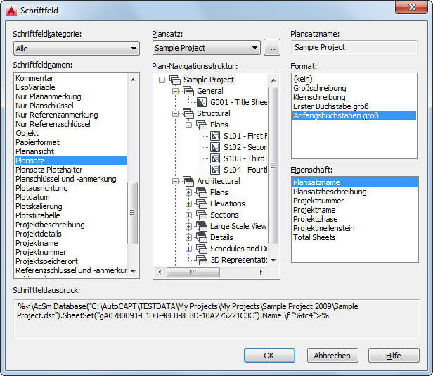 Unter Schriftfeldnamen werden alle plansatzbezogenen Felder angezeigt.