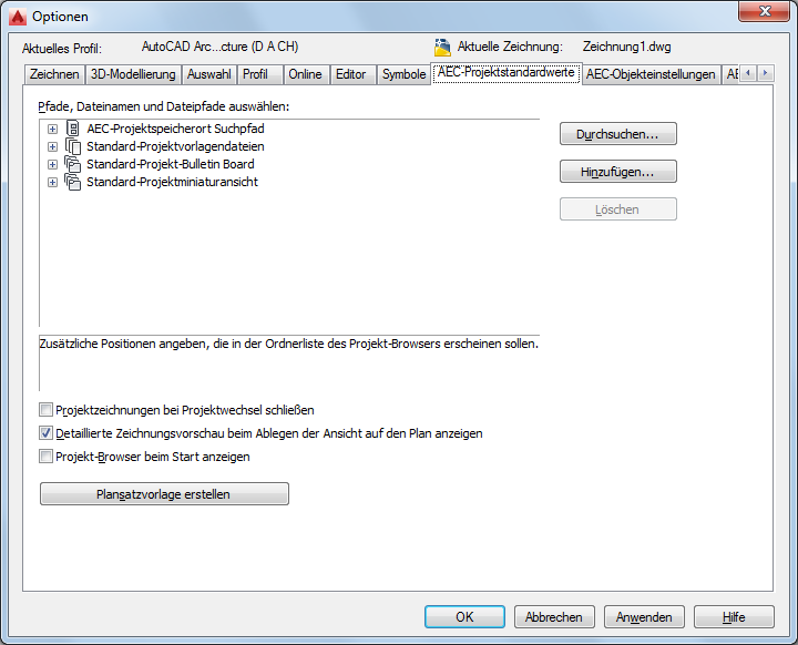 Festlegen der Vorgabeoptionen für AEC-Projektstandardwerte in der aktuelle Zeichnung