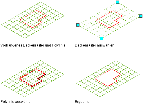 Gehen Sie wie folgt vor, um eine Aussparung in ein bestehendes Deckenraster zu schneiden. Die Aussparung wird aus einer geschlossenen Polylinie oder einem AEC-Objekt erstellt, das innerhalb der Grenzen des Rasters platziert wird. Alle Teile des Rasters innerhalb der Aussparung werden nicht angezeigt.