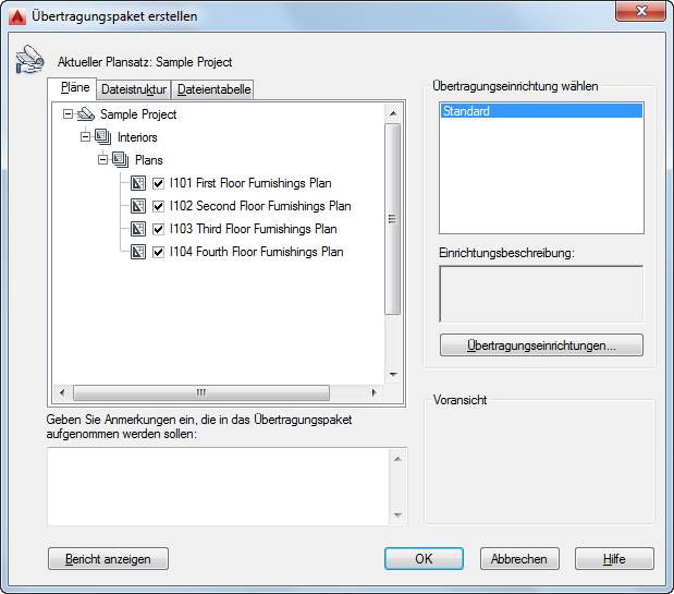Bei der elektronischen Übertragung können Sie einen Dateisatz in elektronischer Form als Paket übermitteln. Die Zeichnungsdateien im Übertragungspaket enthalten auch alle relevanten Zusatzdateien wie externe Referenzen und Schriftartendateien.