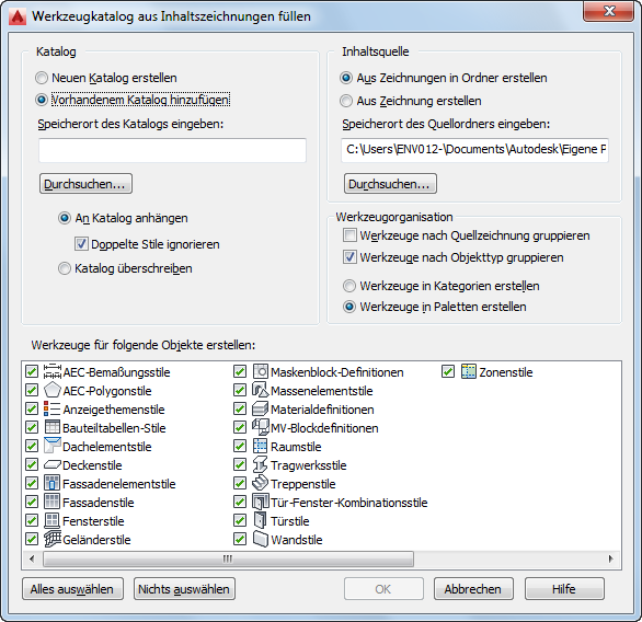 Diese Option ist geeignet, wenn Sie Stile aus mehreren Zeichnungen im Katalog zusammenführen möchten. Die resultierenden Werkzeuge werden dann in Kategorien oder Paletten abgelegt, die nach dem Stiltyp benannt sind, z. B. "Wände", "Türen" usw.