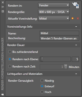 Verwenden Sie den Render-Voreinstellungs-Manager zum Angeben der primären Einstellungen für das Rendern. Sie können auch mit Hilfe der Steuerelemente auf der Multifunktionsleiste einige allgemeine Render-Einstellungen ändern oder eine benannte Render-Voreinstellung als aktuell festlegen.