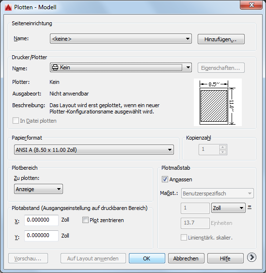 Wählen Sie das Papierformat, den Plotbereich, den Plotmaßstab, die Ausrichtung und weitere Optionen.