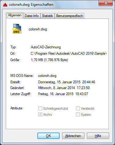 Zeigt den MS-DOS-Namen der Zeichnungsdatei, Datum der Erstellung sowie Datum und Uhrzeit der letzten Änderung und des letzten Zugriffs.