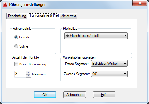 Legt die Anzahl der Führungspunkte fest, die mit dem Befehl SFÜHRUNG abgefragt werden, bevor der Führungsmaßtext angefordert wird. Wenn Sie beispielsweise den Wert 3 festlegen, fordert der Befehl SFÜHRUNG Sie nach Angabe von zwei Führungspunkten auf, den gewünschten Maßtext einzugeben. Die Anzahl der Punkte entspricht der Anzahl der zu erstellenden Führungsliniensegmente plus 1.