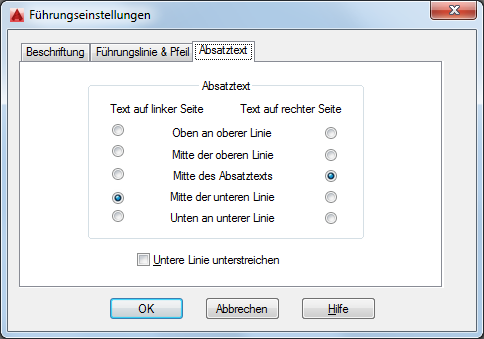Bestimmt den Punkt, an dem die Führungslinien mit einem mehrzeiligen Maßtext verbunden werden sollen. Diese Registerkarte steht nur zur Verfügung, wenn Sie auf der Registerkarte Maßtext den Maßtexttyp MText ausgewählt haben.