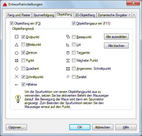 Steuert die aktuellen Einstellungen für den Objektfang.