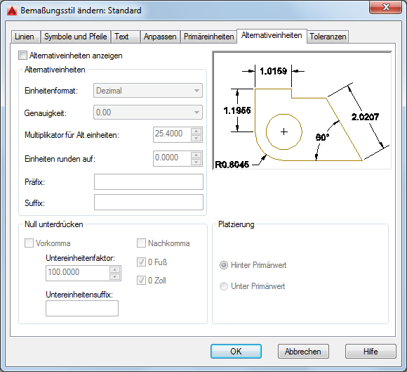 Steuert die Anzeige von Alternativeinheiten in Maßwerten und legt Format sowie Genauigkeit fest.