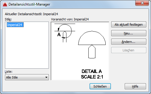 Zeigt eine Liste der Detailansichtsstile an, die in der aktuellen Zeichnungsdatei verfügbar sind. Der aktuelle Stil wird hervorgehoben.