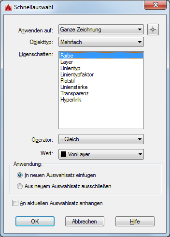 Wenn die Option An aktuellen Auswahlsatz anhängen gewählt ist, werden die Filterkriterien auf die gesamte Zeichnung angewendet.