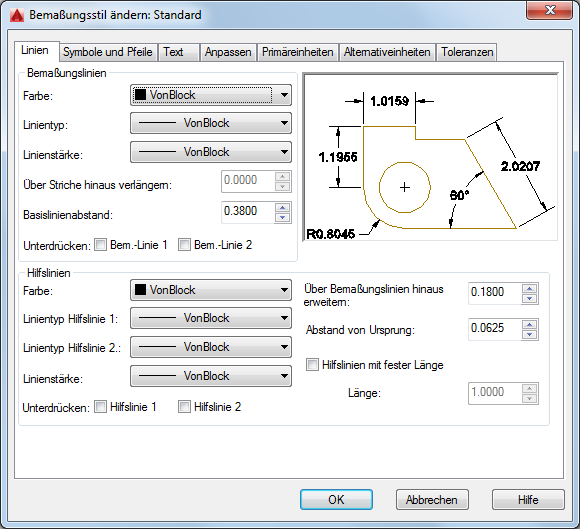 Zur Bestimmung des Formats und der Eigenschaften von Maßlinien, Hilfslinien, Pfeilspitzen und Zentrumsmarken.