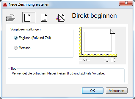 Ist die Schaltfläche Direkt beginnen ausgewählt, wird eine neue Zeichnung erstellt. Es werden entweder englische oder metrische Vorgabeeinstellungen verwendet. Ist die Schaltfläche Vorlage verwenden ausgewählt, wird eine neue Zeichnung unter Verwendung der ausgewählten Zeichnungsvorlage erstellt. Ist die Schaltfläche Assistent verwenden ausgewählt, wird eine neue Zeichnung unter Verwendung der ausgewählten Einstellungen im Assistent für Schnellstart oder im Assistent Benutzerdefiniert erstellt. (Die erste Option, Zeichnung öffnen, steht beim Befehl NEU nicht zur Verfügung. Zum Öffnen einer vorhandenen Zeichnung verwenden Sie den Befehl ÖFFNEN.)