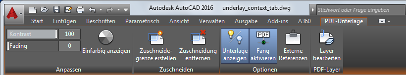 Wenn Sie eine PDF-Unterlage auswählen, wird die kontextabhängige Registerkarte PDF in der Multifunktionsleiste angezeigt.