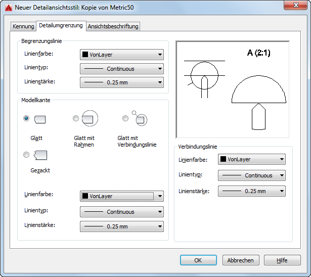 Legt die Eigenschaften für die Detailumgrenzungslinie, die Modellkante und die Verbindungslinie der Detailansichten fest.