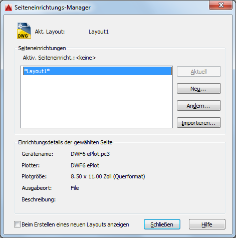 Hier können Sie die aktuelle Seiteneinrichtung anzeigen, eine andere aktuelle Seiteneinrichtung festlegen, neue Seiteneinrichtungen erstellen, vorhandene Seiteneinrichtungen bearbeiten und Seiteneinrichtungen aus anderen Zeichnungen importieren.