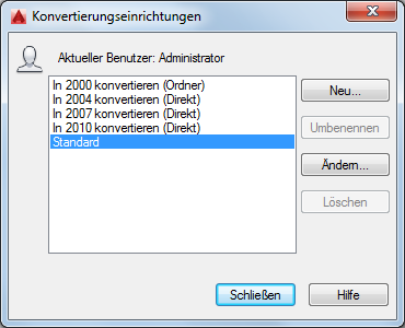 Zeigt das Dialogfeld Konvertierungseinrichtung ändern an, in dem Sie Optionen für die Konvertierung der ausgewählten Zeichnung festlegen können.