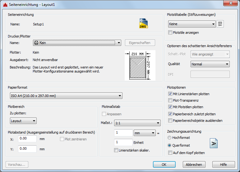 Die von Ihnen angegebenen Seiteneinrichtungseinstellungen werden im Layout gespeichert und können auf andere Layouts angewendet oder in andere Zeichnungen importiert werden.