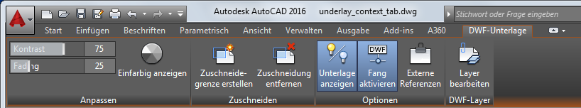 Wenn Sie eine DWF-Unterlage in einer Zeichnung auswählen, wird die Kontextabhängige Registerkarte DWF-Unterlage in der Multifunktionsleiste angezeigt.