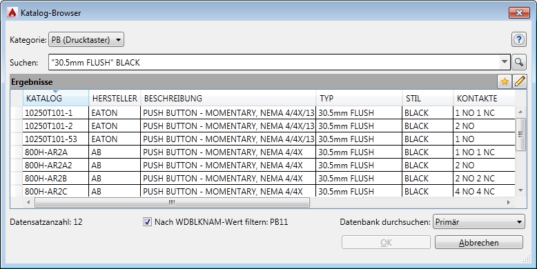 Anmerkung: Unterbaugruppenelemente, wie durch einen Wert für BAUGRUPPENLISTE definiert, werden nicht in die Suchergebnisse aufgenommen. Verwenden Sie den Bearbeitungsmodus des Katalog-Browsers zum Anzeigen und Bearbeiten von Unterbaugruppenelementen.