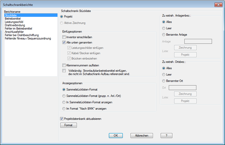 Geben Sie an, ob das Projekt, die aktive Zeichnung oder ausgewählte Objekte verarbeitet werden sollen. Wenn Projekt ausgewählt ist, bieten einige Berichte eine Option zur Auswahl der zu verarbeitenden Zeichnungen.