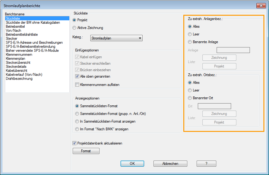 Standardmäßige Stromlaufplan- und Schaltschrankberichte werden zur Verfügung gestellt. Stromlaufplanberichte extrahieren nur die Daten aus Stromlaufplan-Betriebsmitteln. Schaltschrankberichte extrahieren Daten aus Schaltschrank-Betriebsmitteln. Die Ausnahme bildet die Schaltschrank-Stückliste, die beliebige Stromlaufplan-Betriebsmittel umfasst, die in keinem Schaltschrankaufbau vermerkt sind.