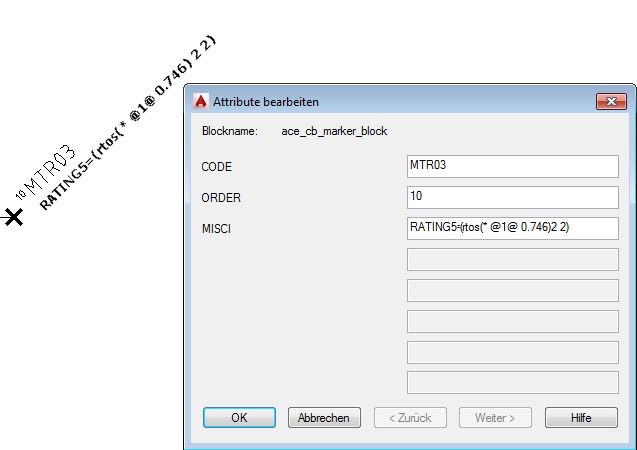 - Bearbeiten Sie seinen MISC1-Attributwert unter Verwendung des Formats "{Attributname}=(AutoLISP-Ausdruck). Beispiel: Rechnen Sie den PS-Wert in Kilowatt um, und übertragen Sie diesen Wert in das Attribut RATING5 auf dem Motorsymbol. Geben Sie folgenden Ausdruck für das MISC1-Attribut des Bezeichnungsblocks ein: