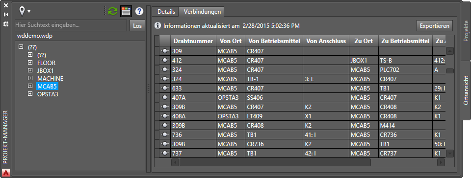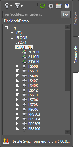 Die Verknüpfung ermöglicht den Austausch von Daten zwischen der 2D- und 3D-Elektroplanung. Nachdem Sie Ihr Projekt verknüpft haben, verwenden Sie zum Anzeigen der Betriebsmittel und Daten aus AutoCAD Electrical und Inventor die Registerkarte Ortsansicht.