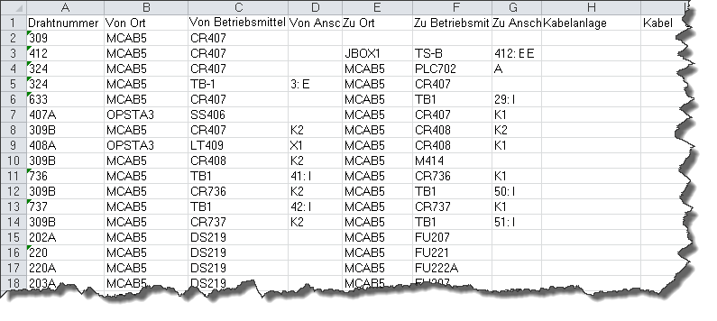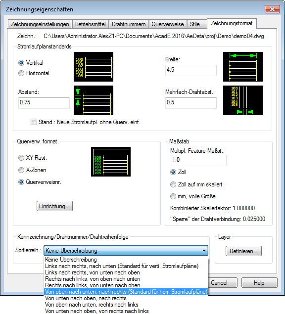 Die Zeichnungs- und Projekteigenschaft der Sortierreihenfolge gilt nun sowohl für die Drahtsequenz als auch für die Beschriftungen und Drahtnummern. Diese Einstellung bietet eine Vorgabedrahtverteilung für Drahtnetze mit mehreren Betriebsmitteln.