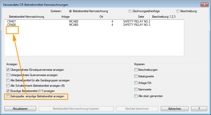 Anmerkung: Die einpolige Referenz wird nur berücksichtigt, wenn das Kontrollkästchen Einpolige Betriebsmittel anzeigen ebenfalls aktiviert ist.