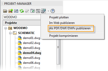 Zum Drucken Ihres Projekts verwenden Sie die Schaltfläche Publizieren/Plotten im Projekt-Manager.