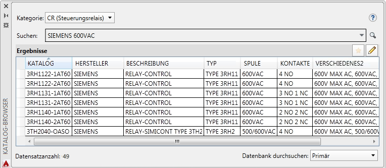 Wenn der Katalog-Browser die Tabelle _LISTBOX_DEF nun das nächste Mal für eine Relaisspule verwendet, wird das Dialogfeld bereits mit der vordefinierten und ausgeführten Suche geöffnet.