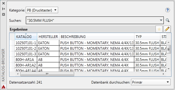 Wählen Sie einen Katalogwert aus der Katalogdatenbank aus, und fügen Sie das zugeordnete Stromlaufplan-Betriebsmittel ein.