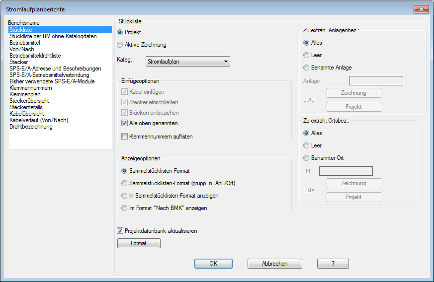 Geben Sie an, ob das Projekt, die aktive Zeichnung oder ausgewählte Objekte verarbeitet werden sollen. Wenn Projekt ausgewählt ist, bieten einige Berichte eine Option zur Auswahl der zu verarbeitenden Zeichnungen.